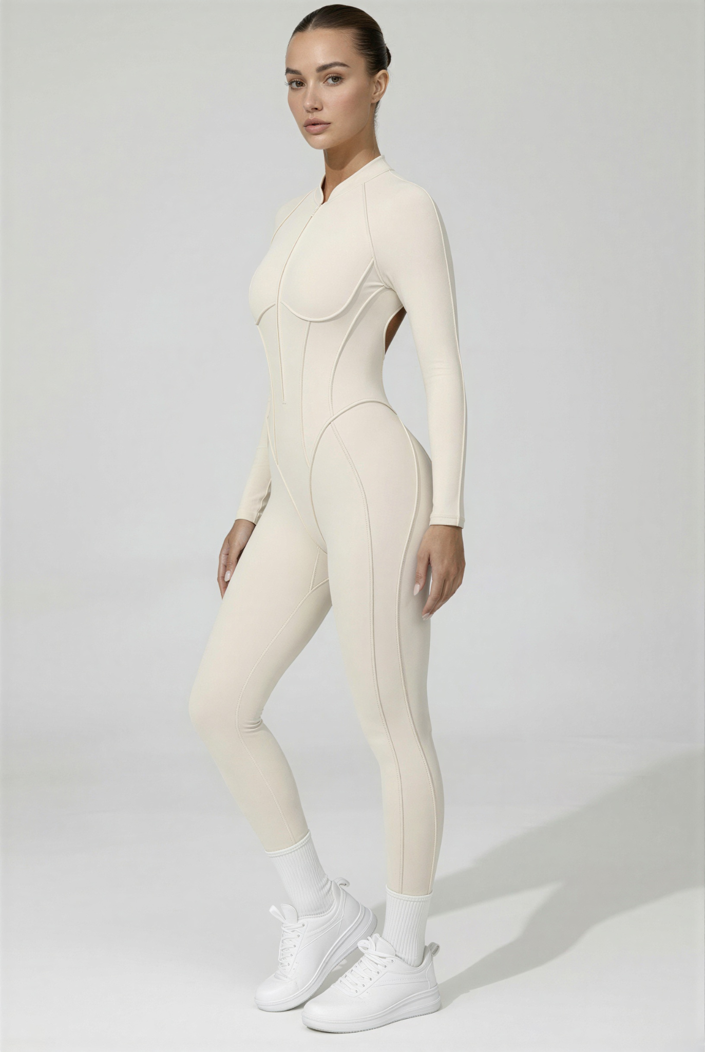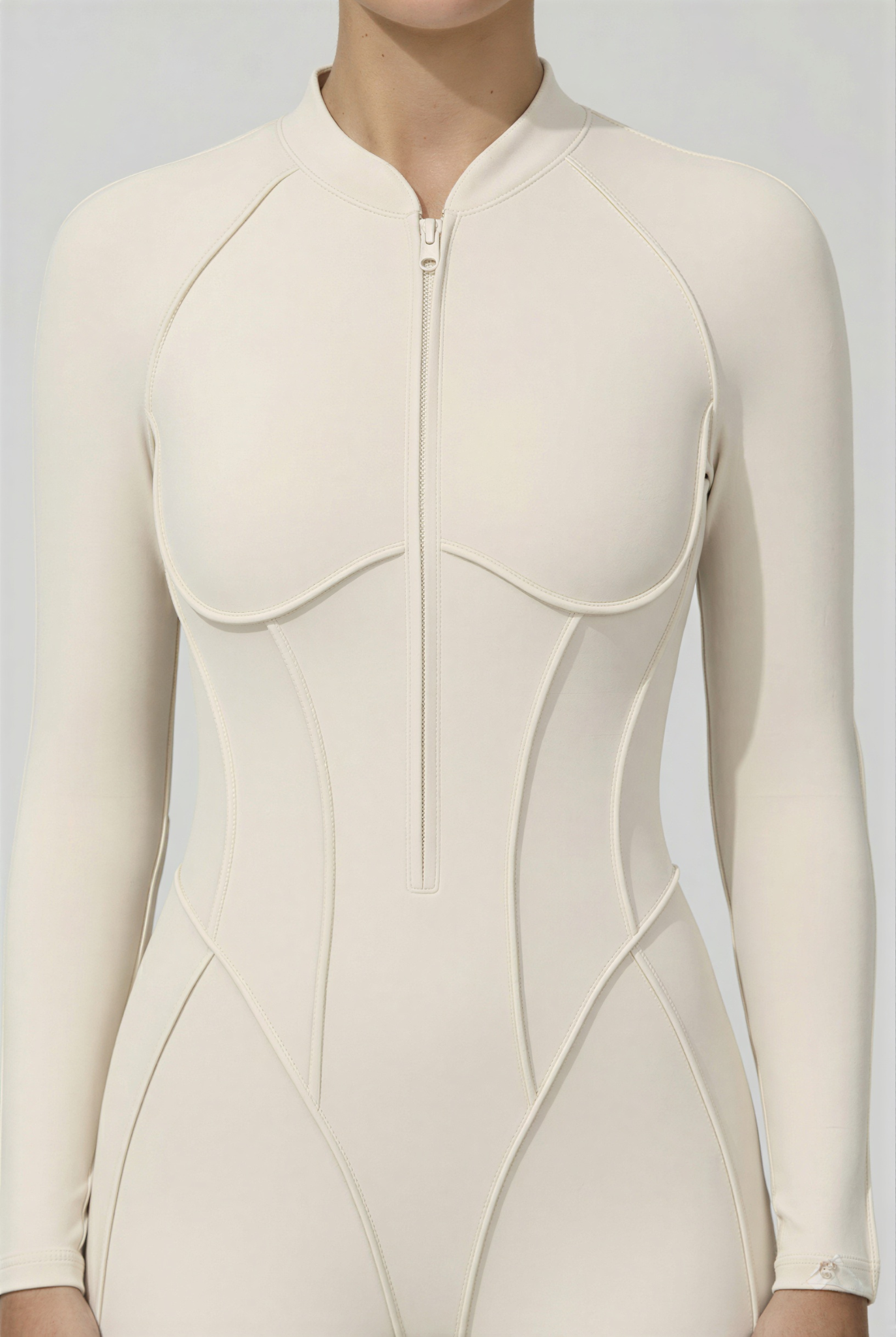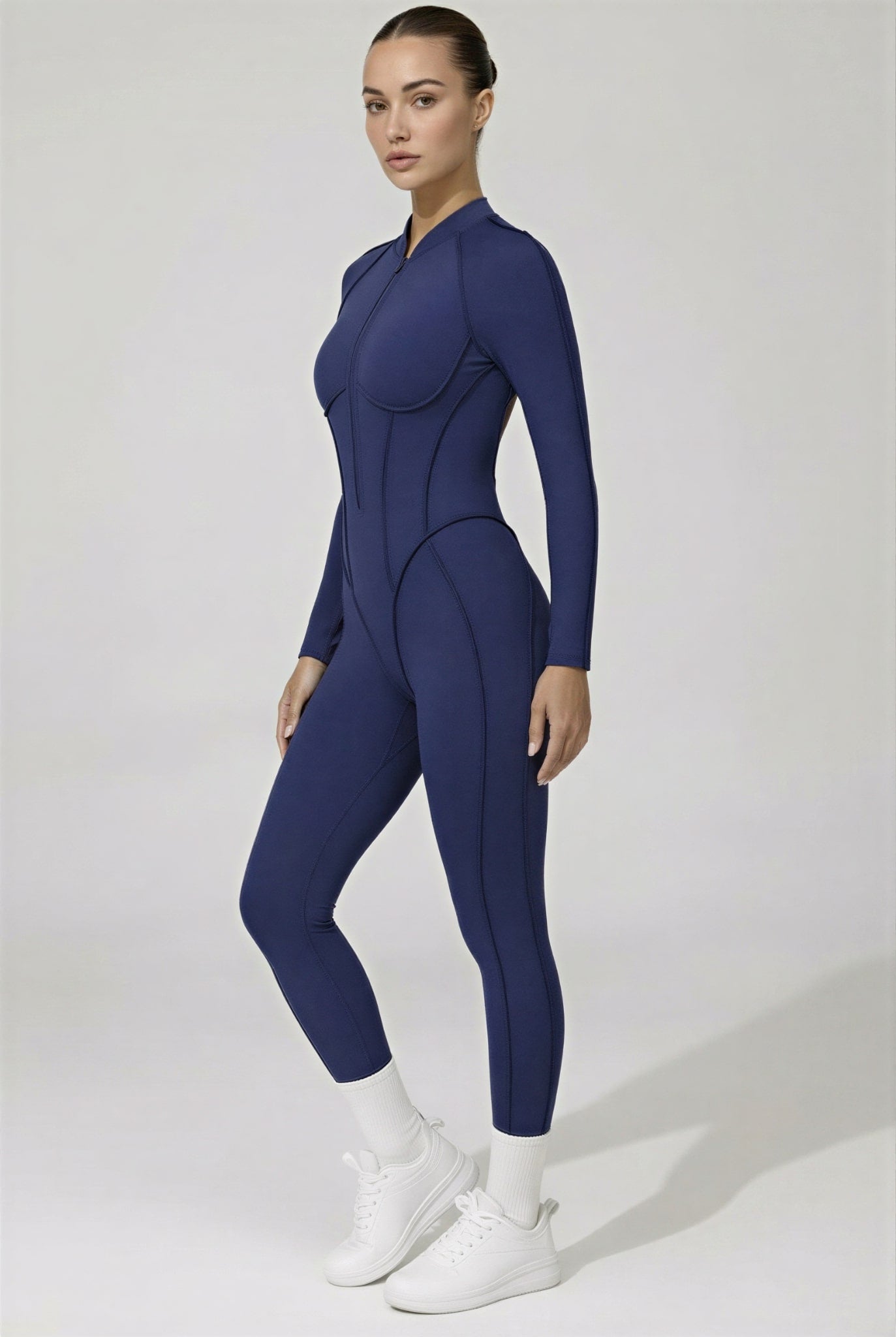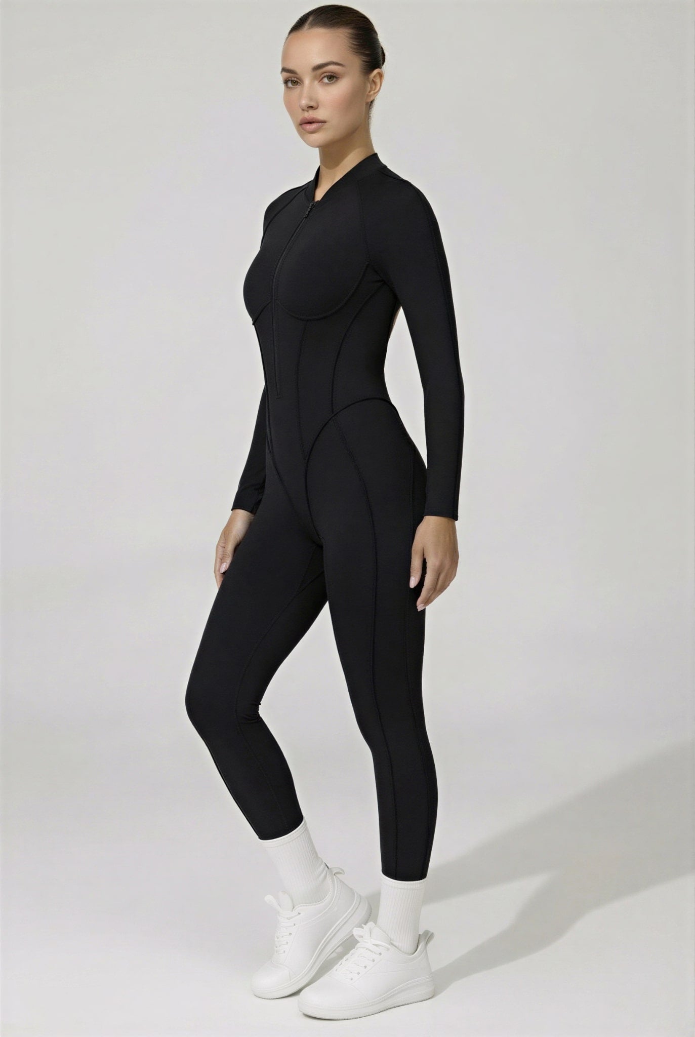 Cette combinaison intégrale présente une fermeture zippée sur l’avant et une ouverture arrondie dans le dos. Elle est conçue avec des coutures structurées qui suivent les lignes du corps et un tissu extensible permettant une bonne liberté de mouvement. La coupe est longue, ajustée, avec des manches longues et un col montant.