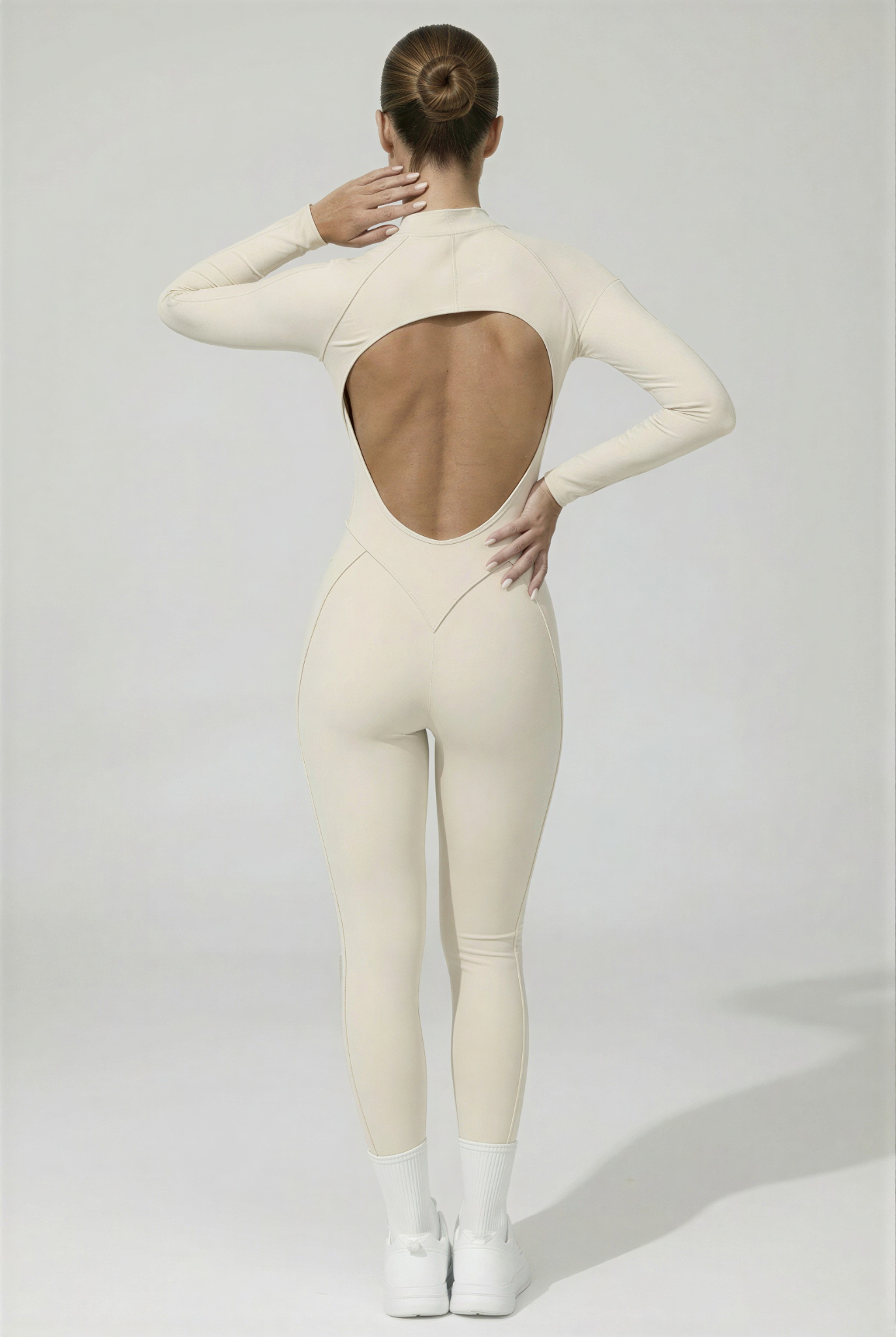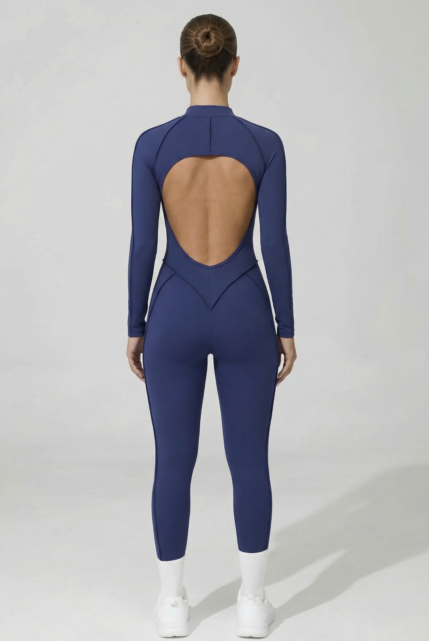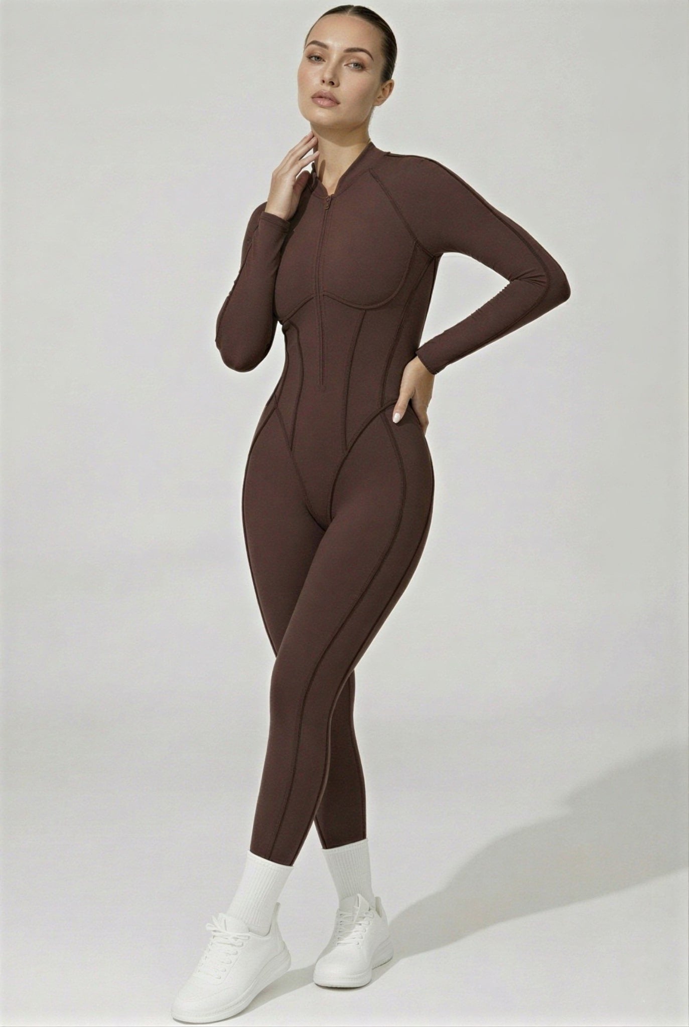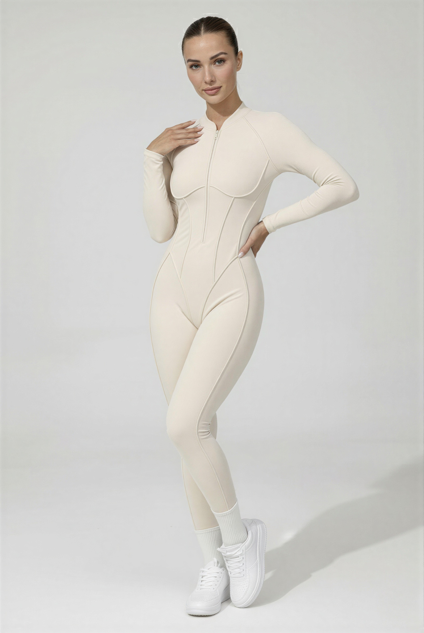 Cette combinaison intégrale présente une fermeture zippée sur l’avant et une ouverture arrondie dans le dos. Elle est conçue avec des coutures structurées qui suivent les lignes du corps et un tissu extensible permettant une bonne liberté de mouvement. La coupe est longue, ajustée, avec des manches longues et un col montant.