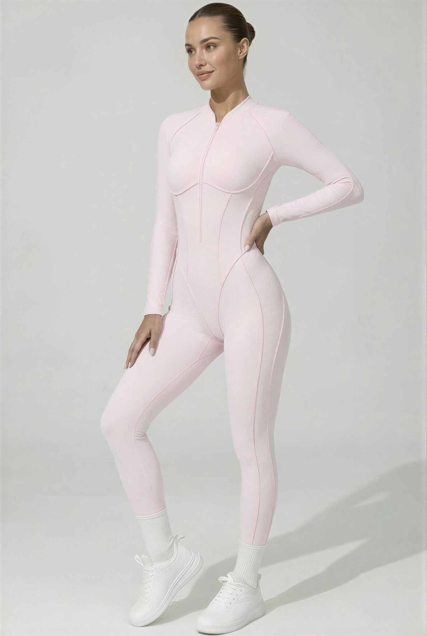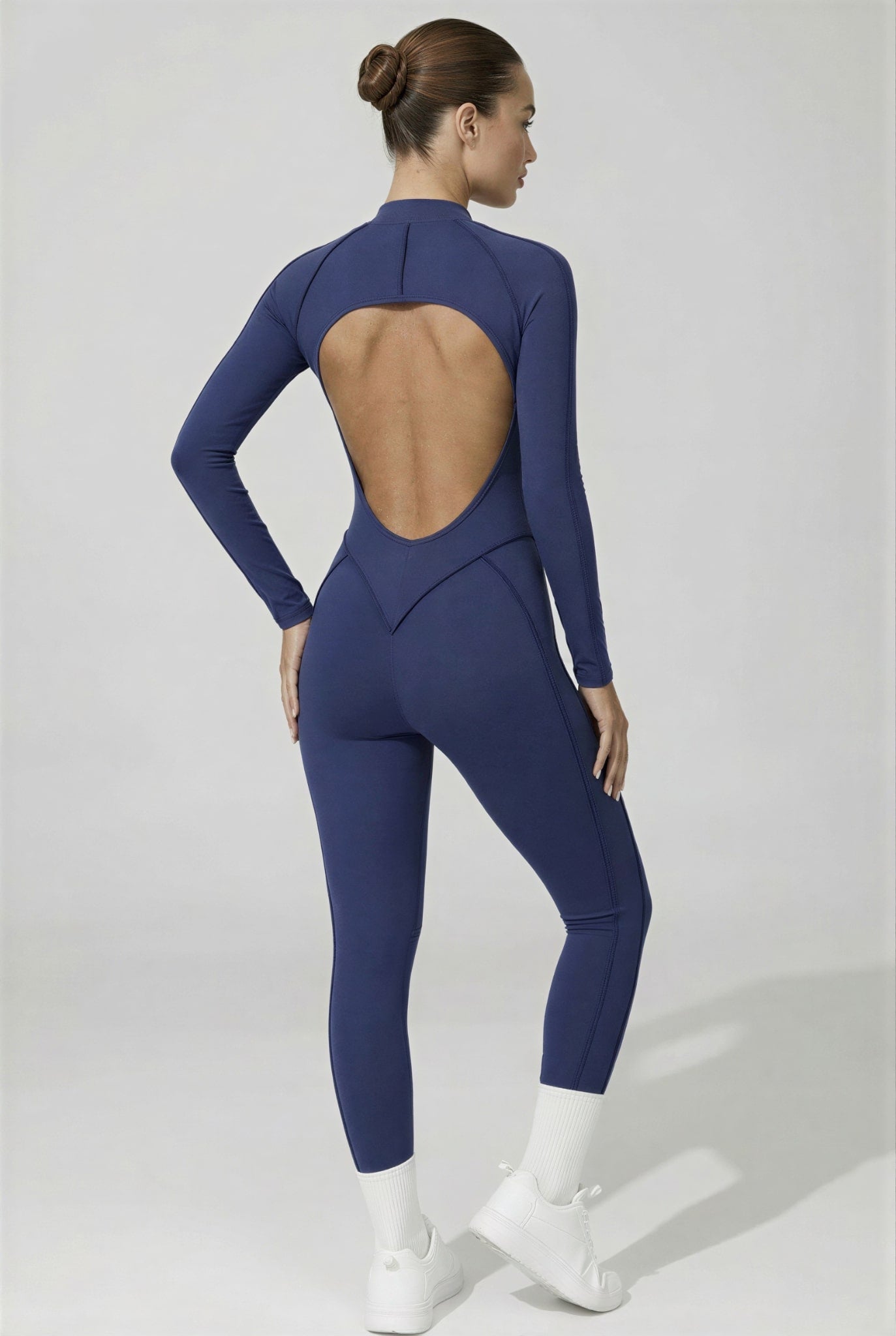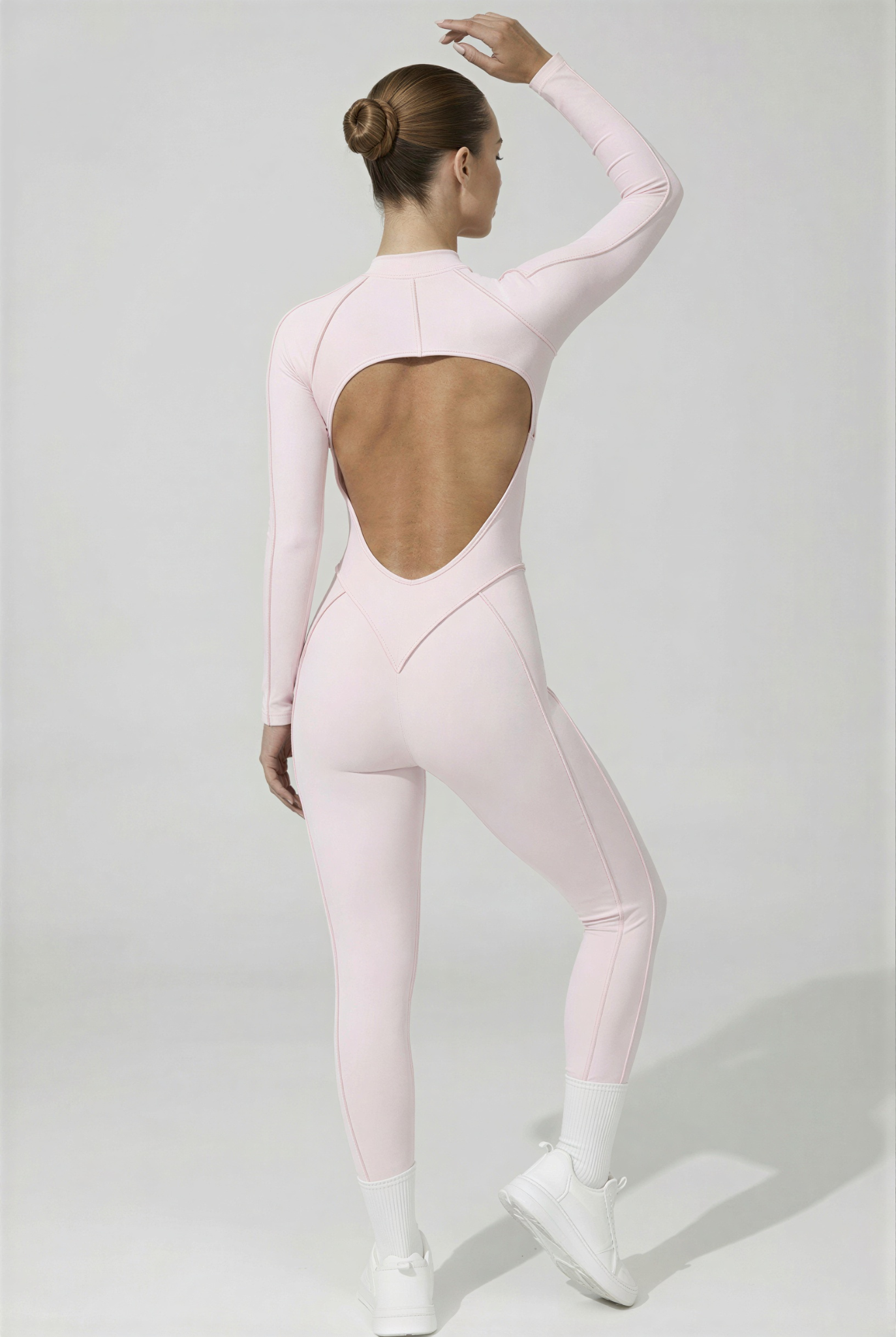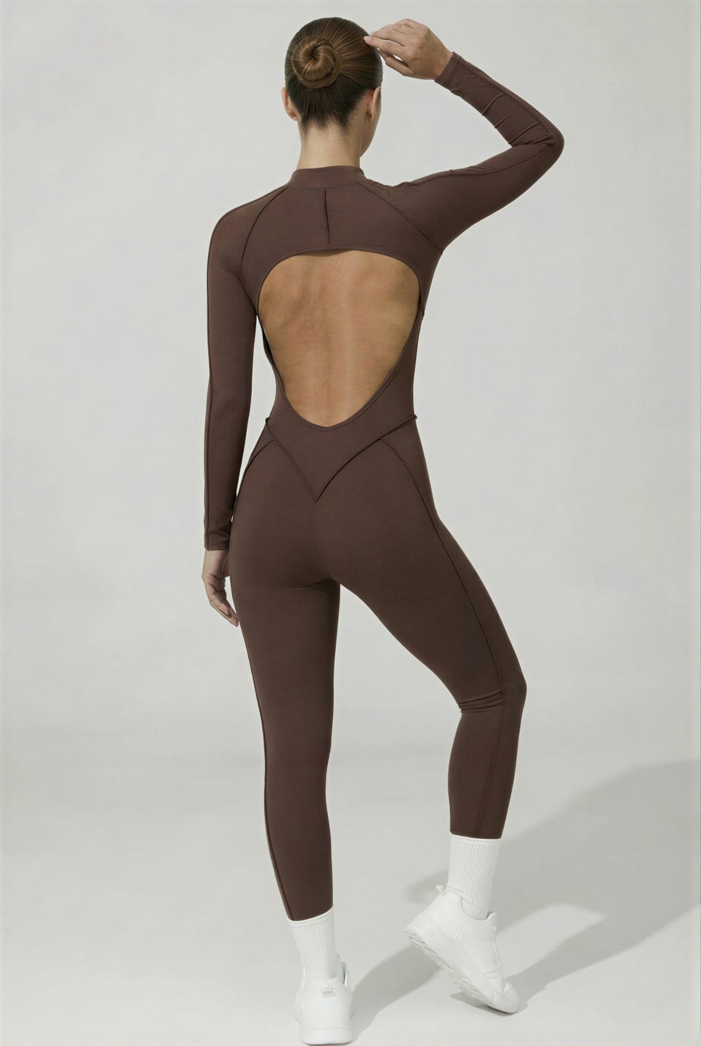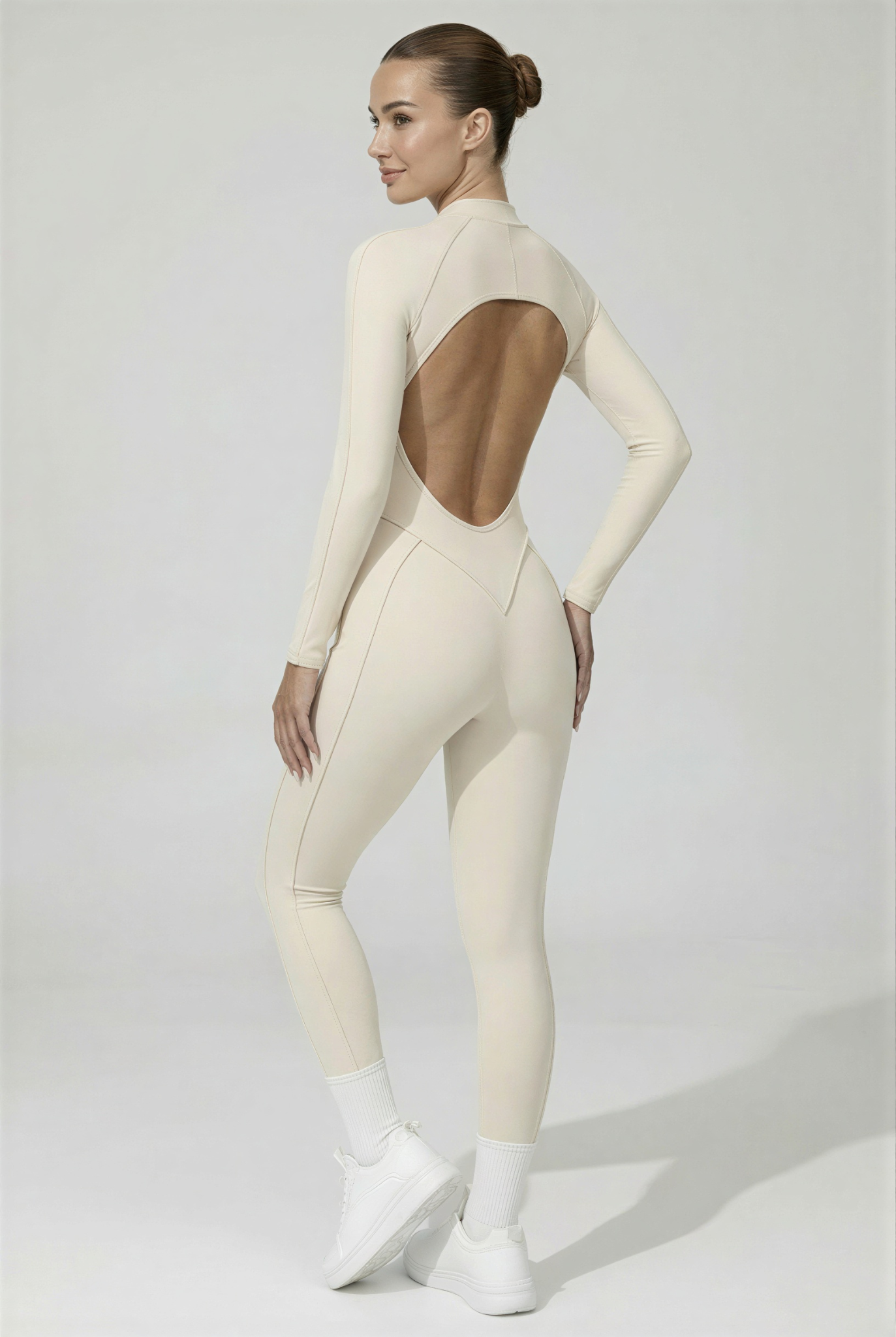 Cette combinaison intégrale présente une fermeture zippée sur l’avant et une ouverture arrondie dans le dos. Elle est conçue avec des coutures structurées qui suivent les lignes du corps et un tissu extensible permettant une bonne liberté de mouvement. La coupe est longue, ajustée, avec des manches longues et un col montant.