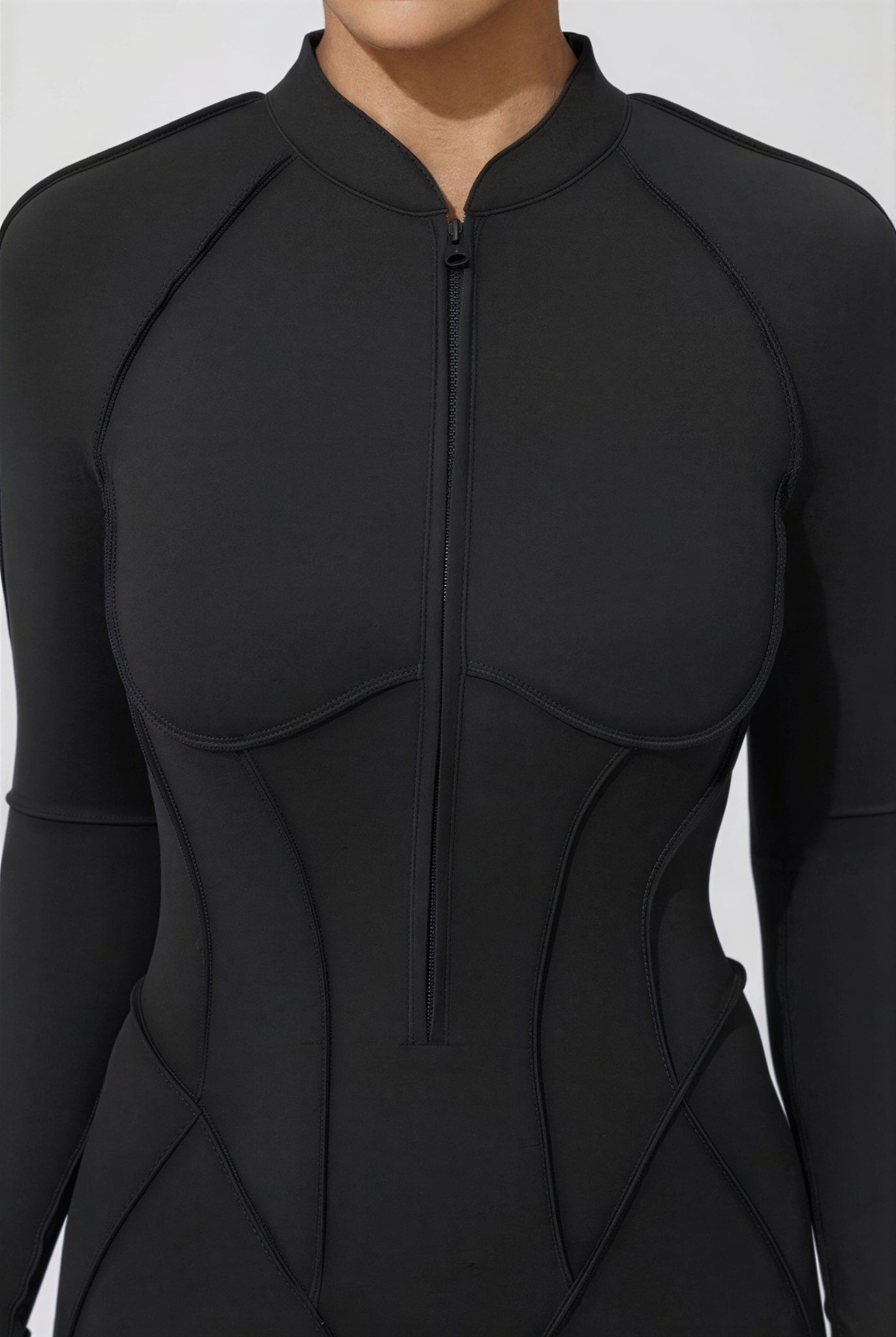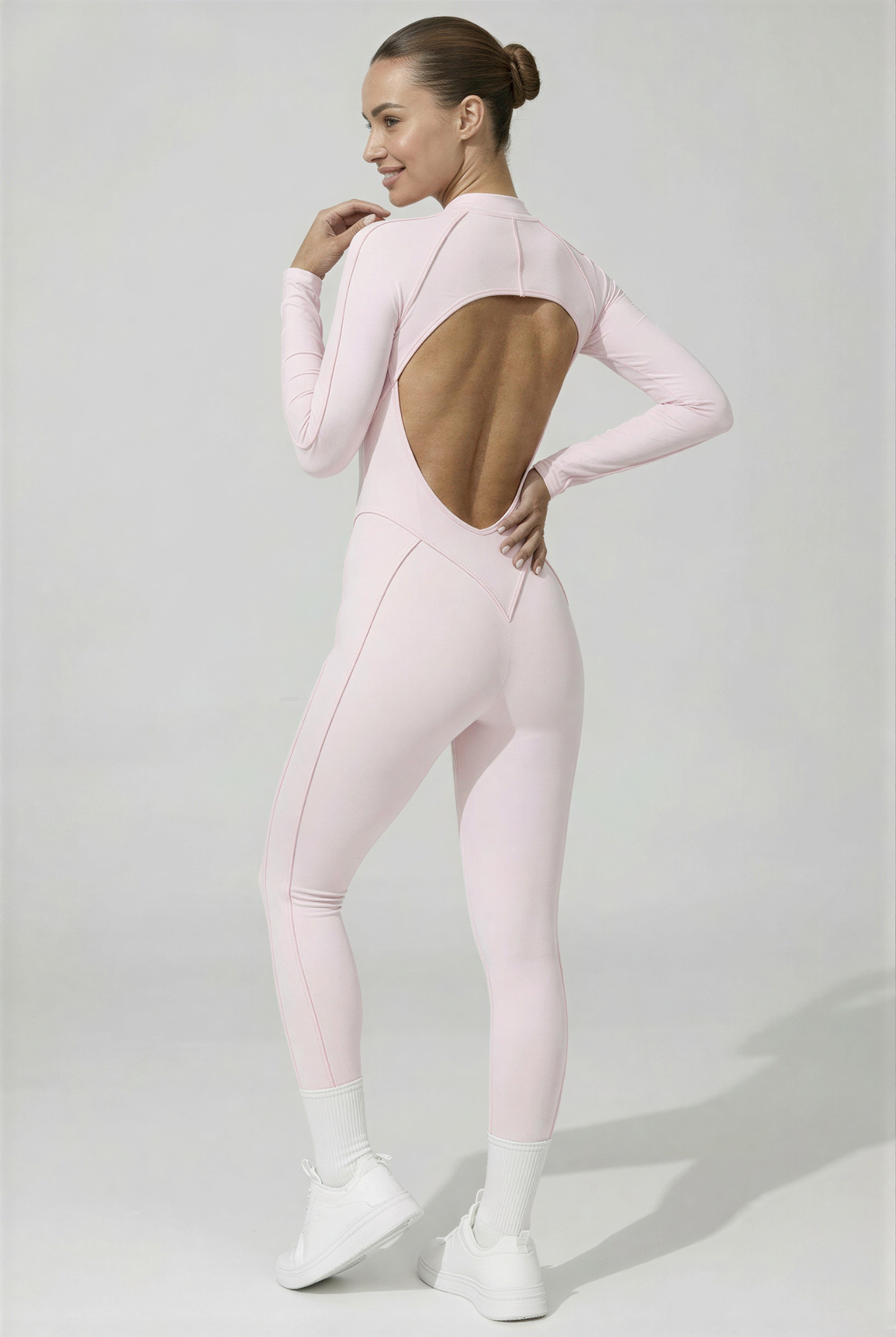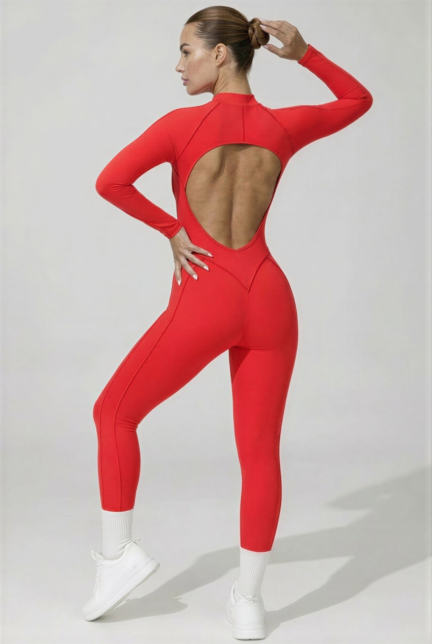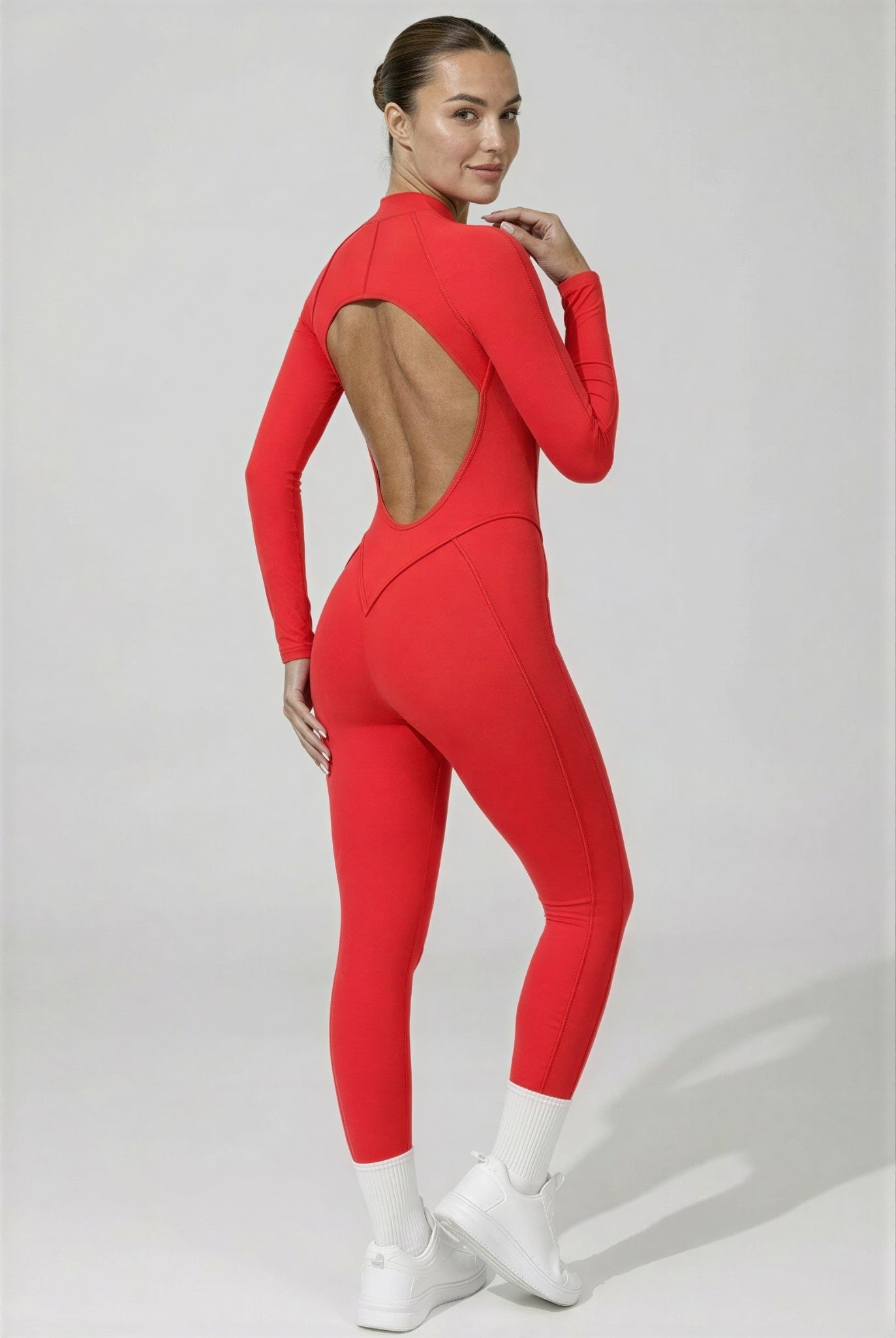 Cette combinaison intégrale présente une fermeture zippée sur l’avant et une ouverture arrondie dans le dos. Elle est conçue avec des coutures structurées qui suivent les lignes du corps et un tissu extensible permettant une bonne liberté de mouvement. La coupe est longue, ajustée, avec des manches longues et un col montant.