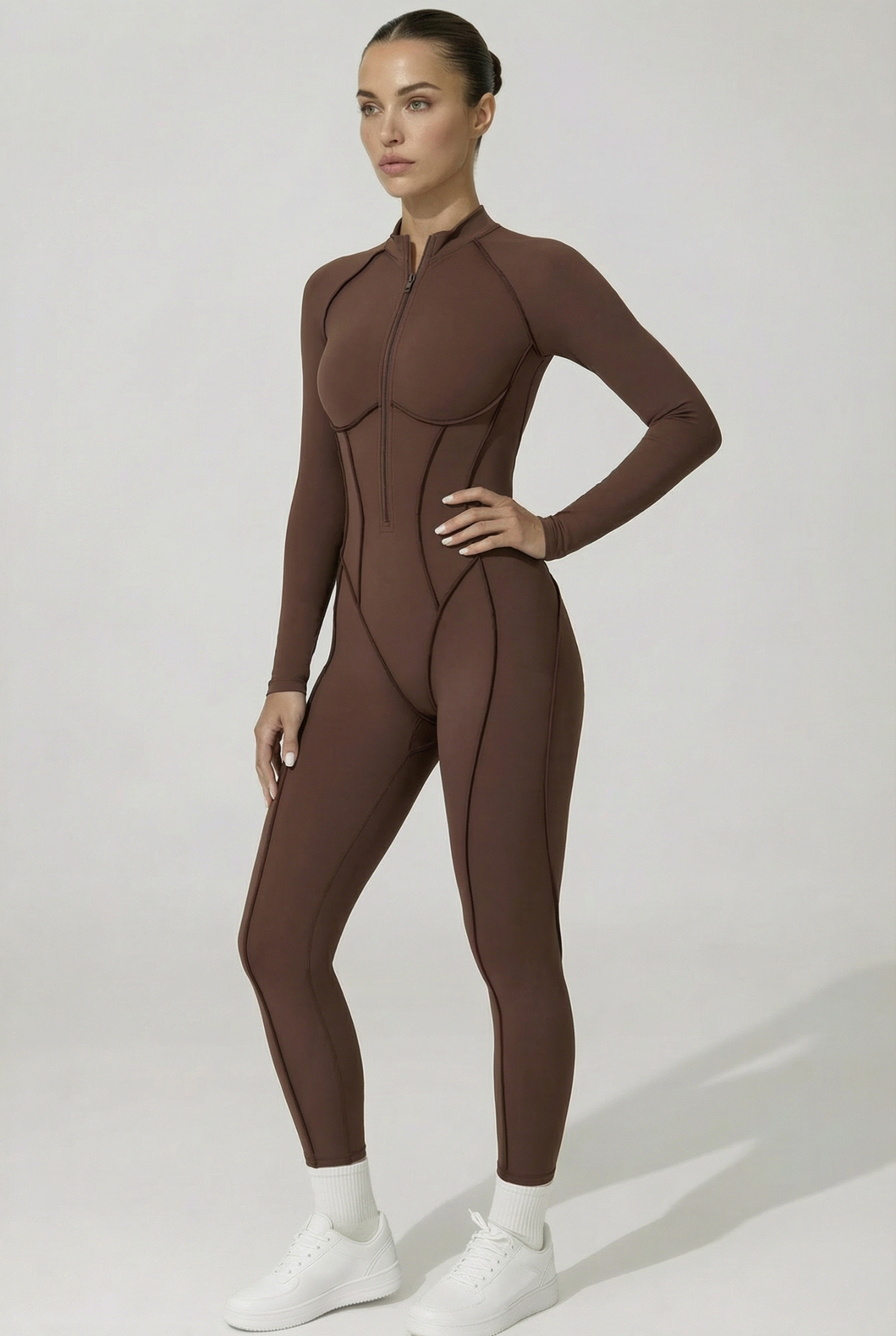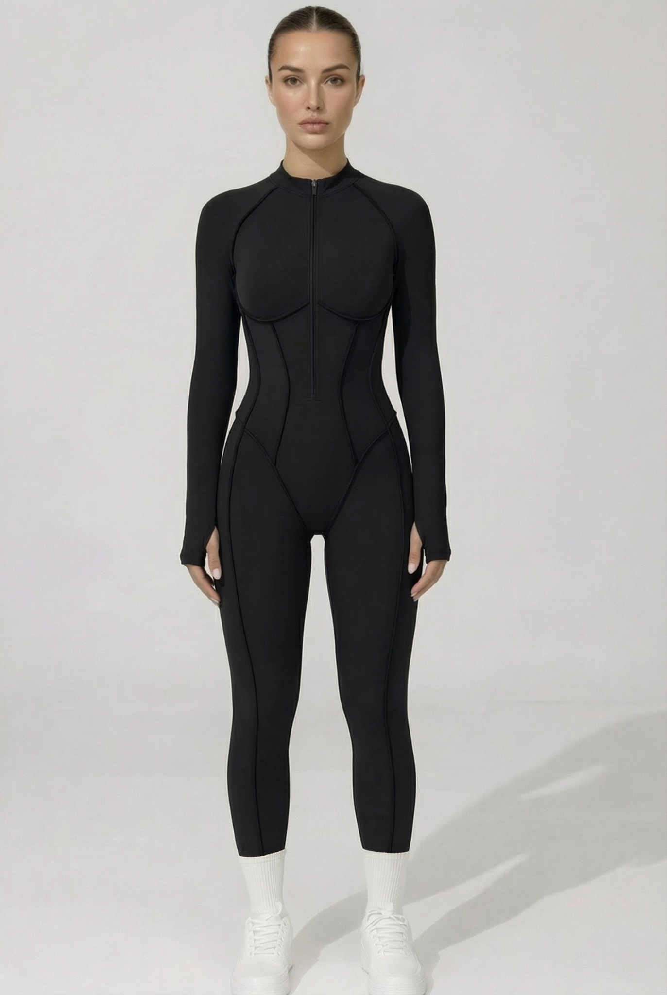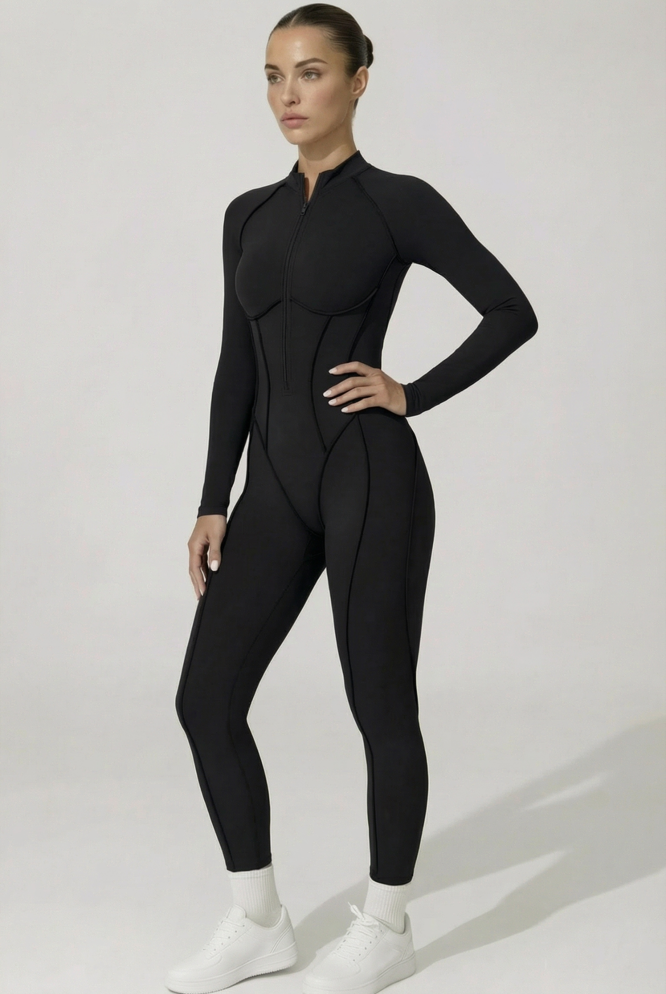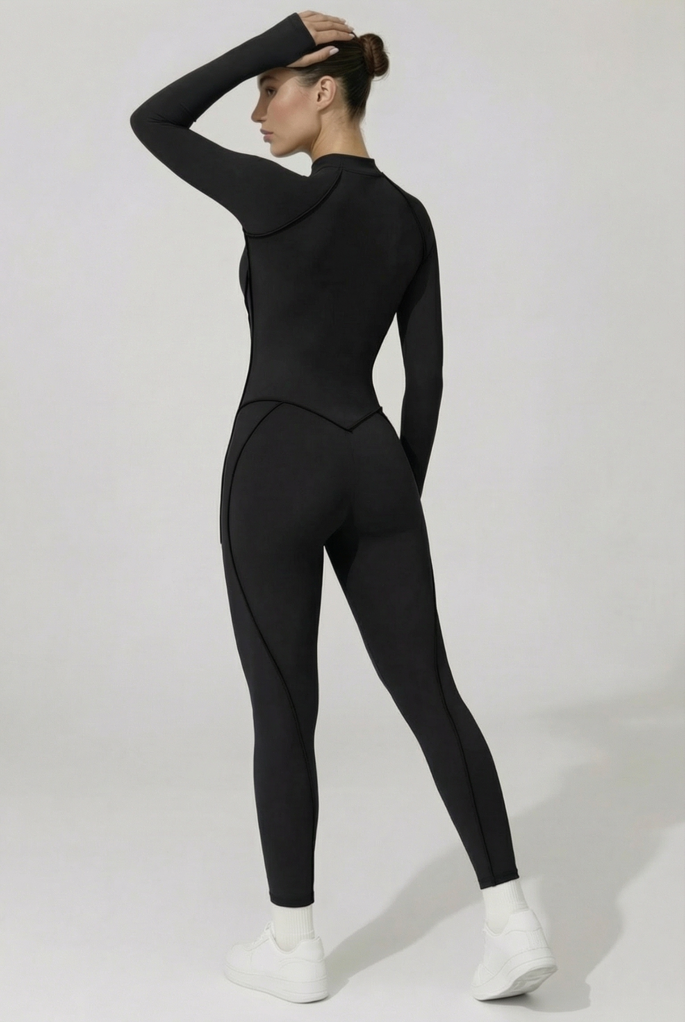 Cette combinaison intégrale présente une fermeture zippée sur l’avant . Elle est conçue avec des coutures structurées qui suivent les lignes du corps et un tissu extensible permettant une bonne liberté de mouvement. La coupe est longue, ajustée, avec des manches longues et un col montant.