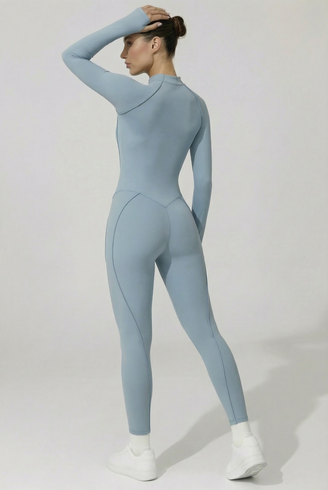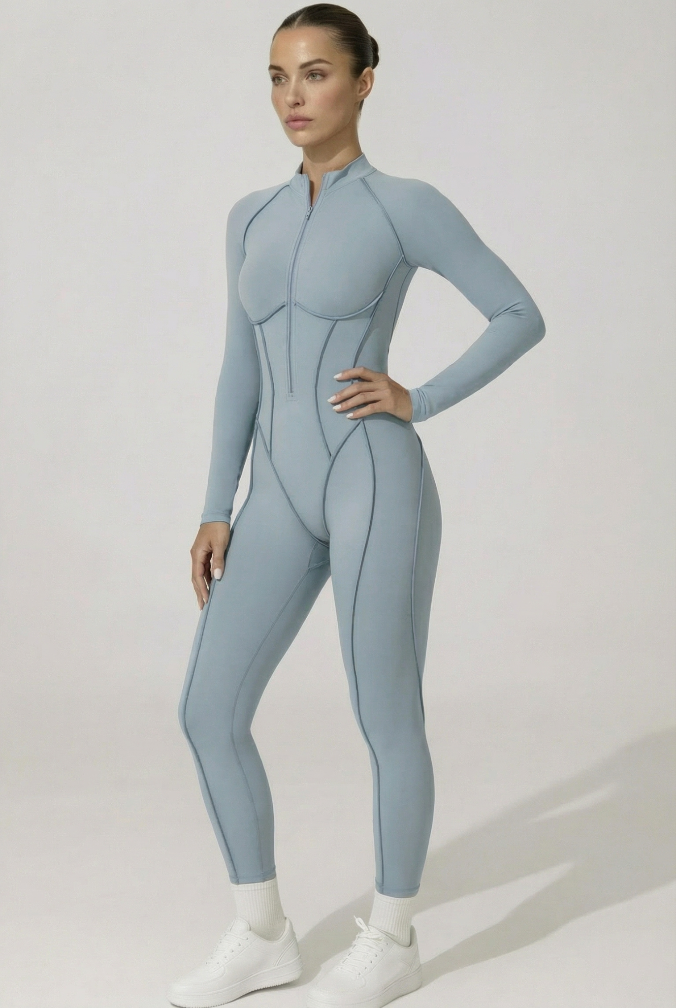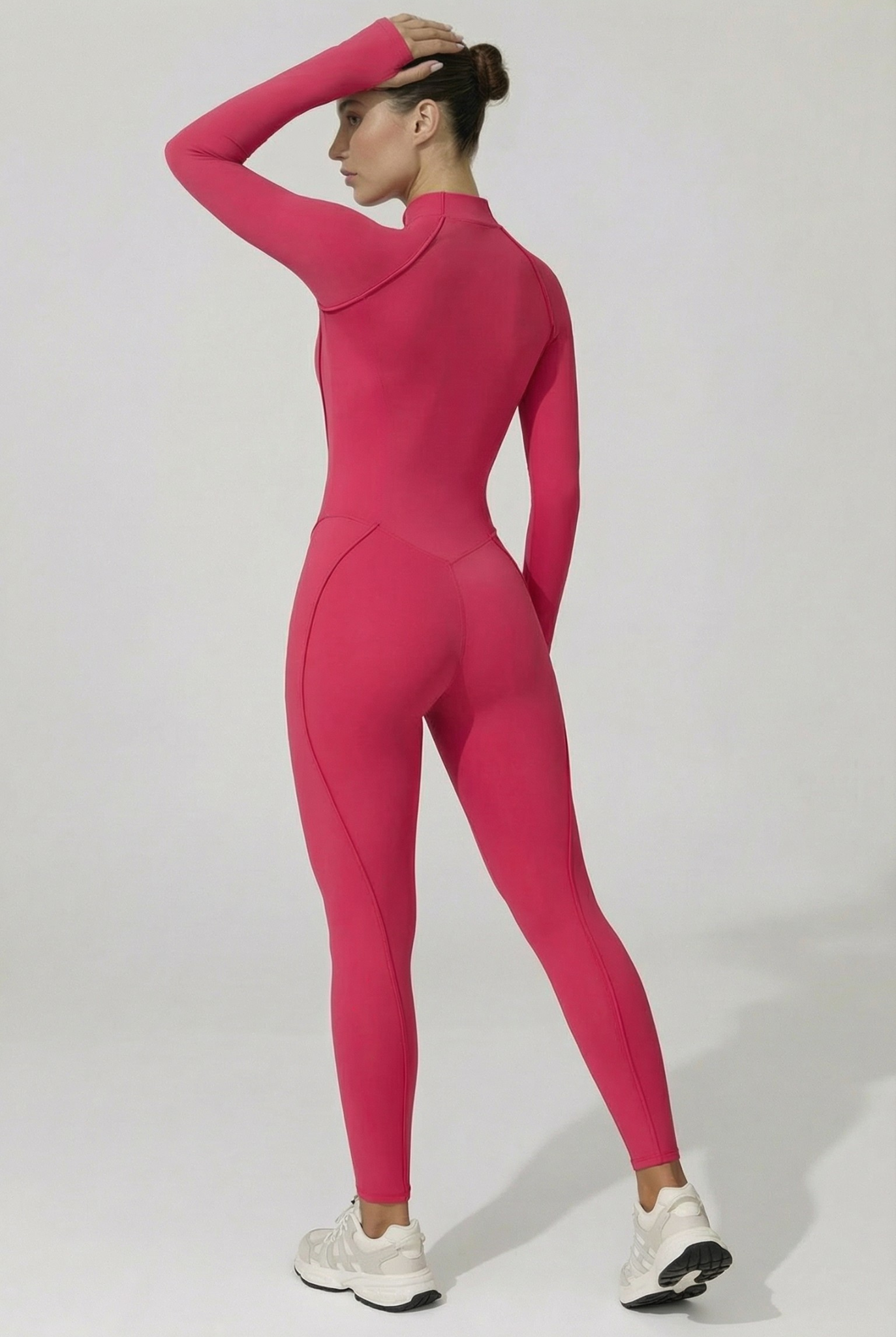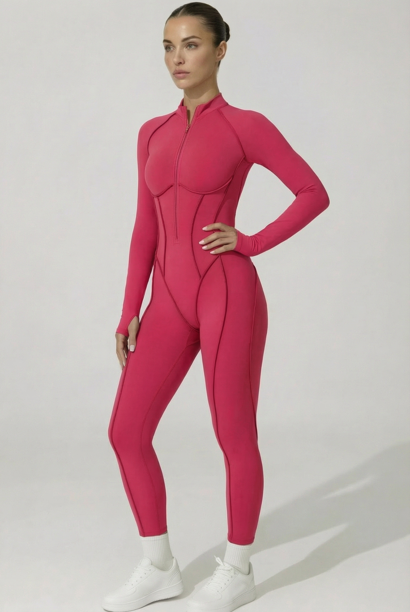 Cette combinaison intégrale présente une fermeture zippée sur l’avant . Elle est conçue avec des coutures structurées qui suivent les lignes du corps et un tissu extensible permettant une bonne liberté de mouvement. La coupe est longue, ajustée, avec des manches longues et un col montant.