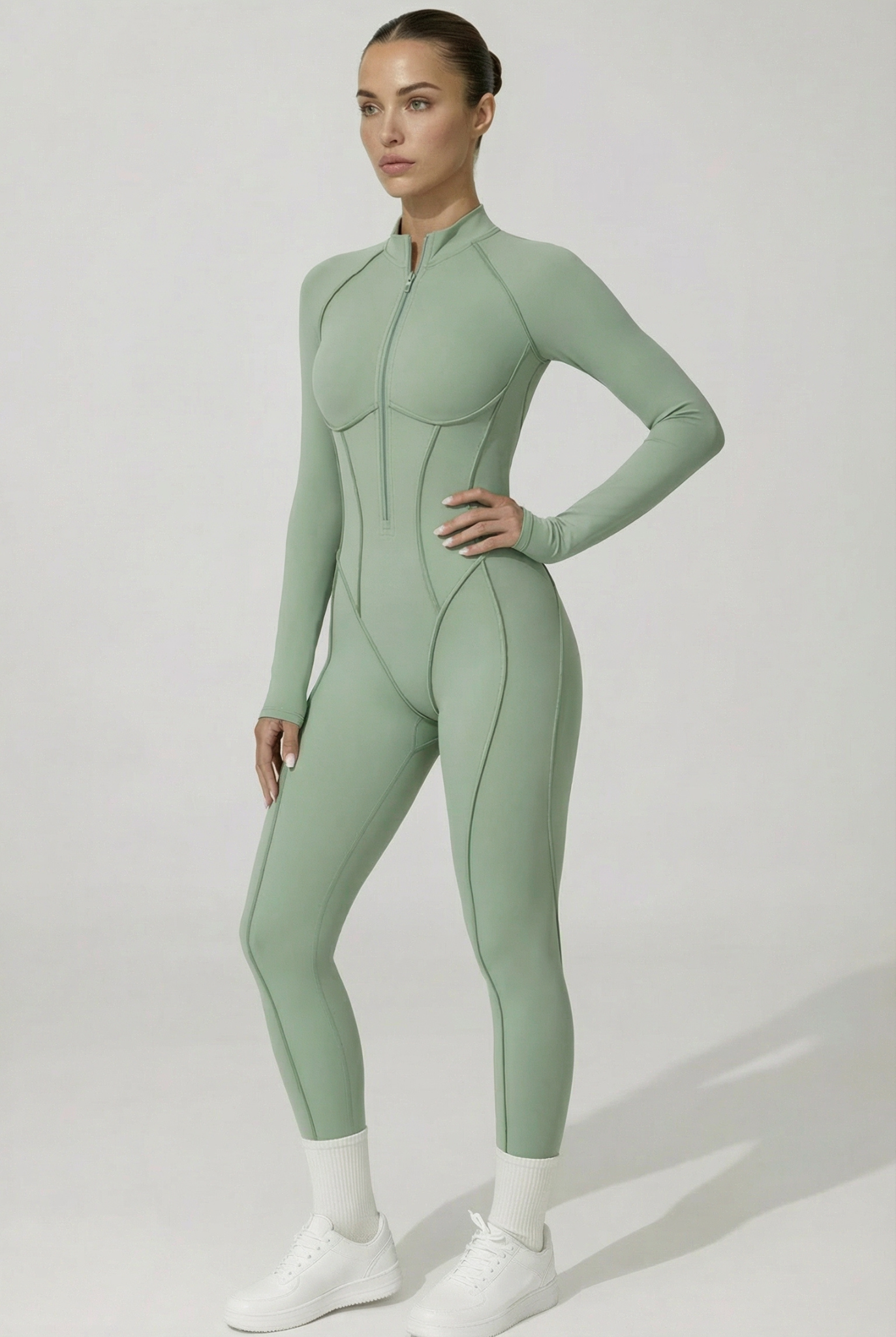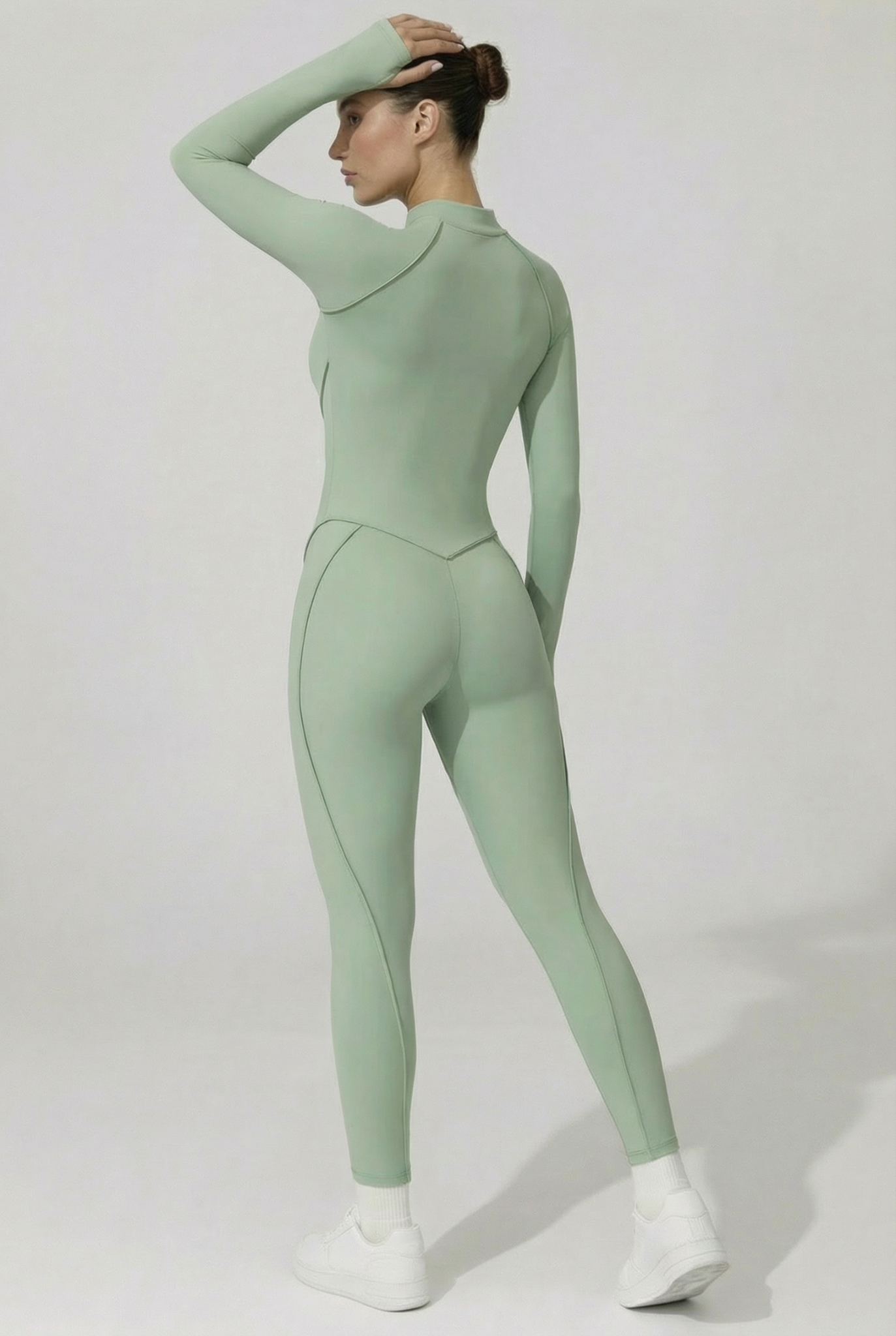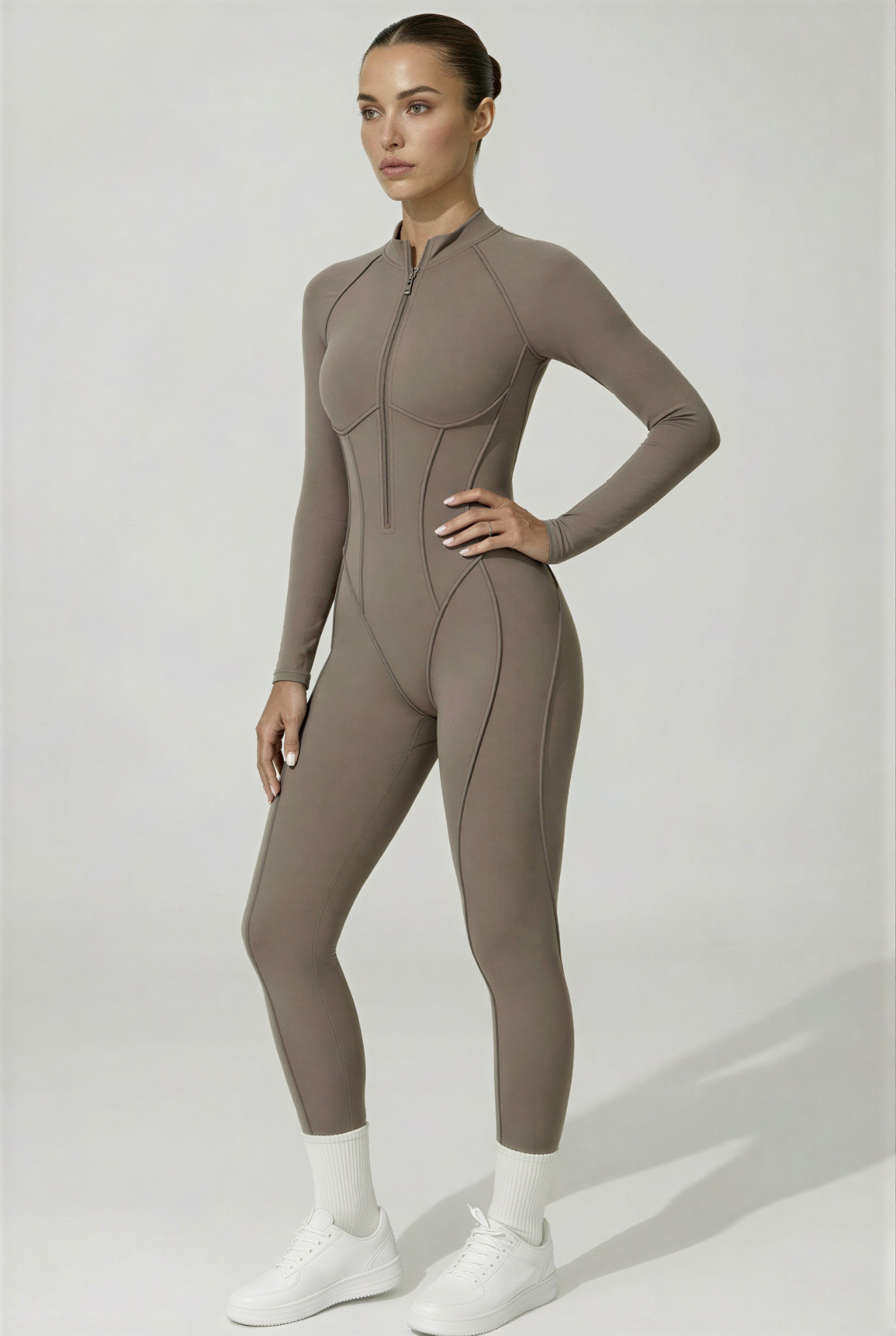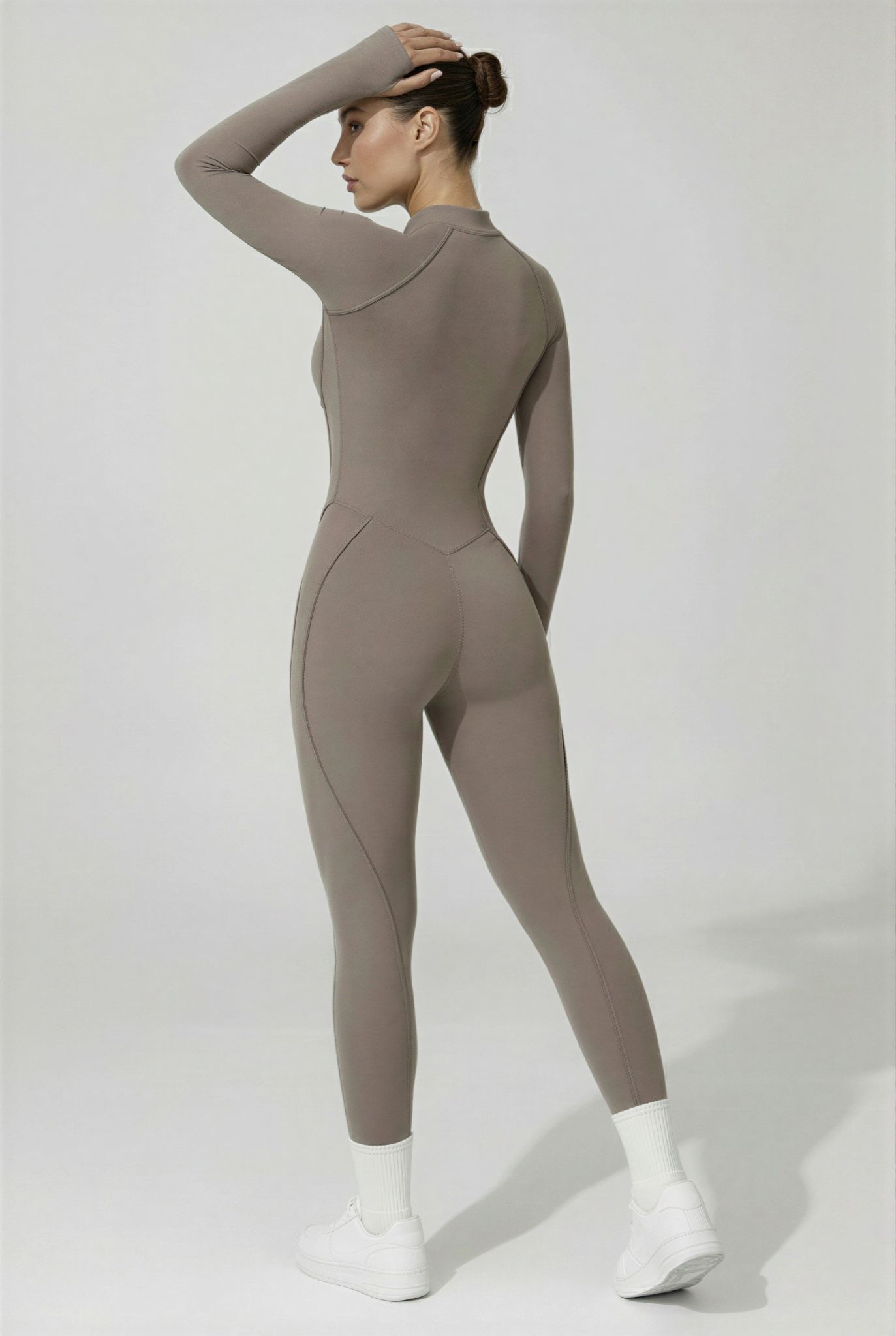 Cette combinaison intégrale présente une fermeture zippée sur l’avant . Elle est conçue avec des coutures structurées qui suivent les lignes du corps et un tissu extensible permettant une bonne liberté de mouvement. La coupe est longue, ajustée, avec des manches longues et un col montant.